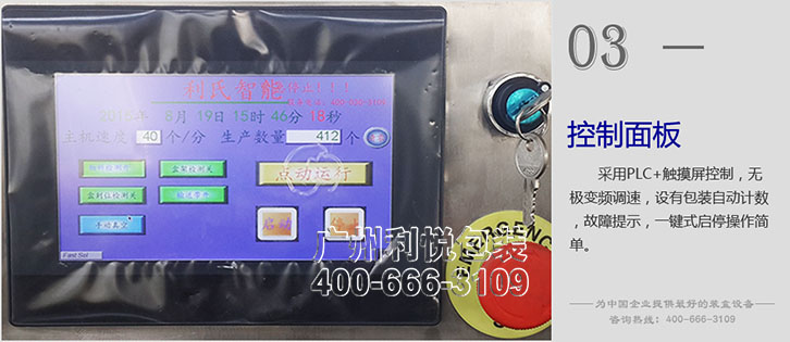 机器采用PLC控制,触摸屏操作界面,速度1-40盒/分钟可调,带纸盒包装自动计数,故障显示功能。