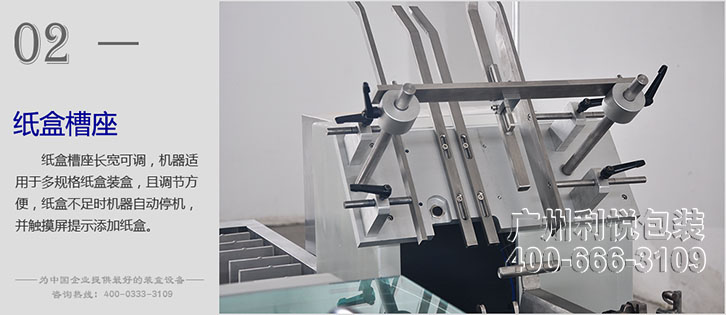纸盒槽座可调,适用于多规格纸盒装盒,且调节方便,纸盒不足时机器自动停机,并触摸屏提示添加纸盒。